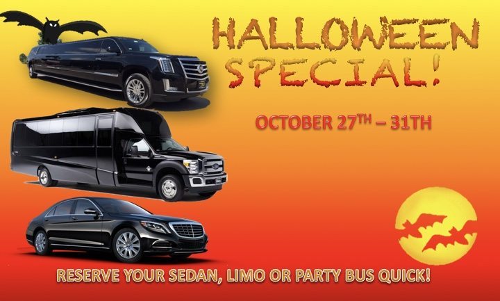 Rent a luxury sedan, limousine, SUV Limo or Party Bus Limo on Friday, October 27, 2017 for Halloween for 6 hours and we will give you your limousine or bus for one hour free! This means you can keep your ride for the whole evening to get from one party to the next and to bring you home safely at the end of your night. You will have your ride for 7 hours when you pay for just 6 hours. Call our office now at 214-907-6330 or e-mail us at info@igportlimos.com to get your low rates for this GREAT deal.