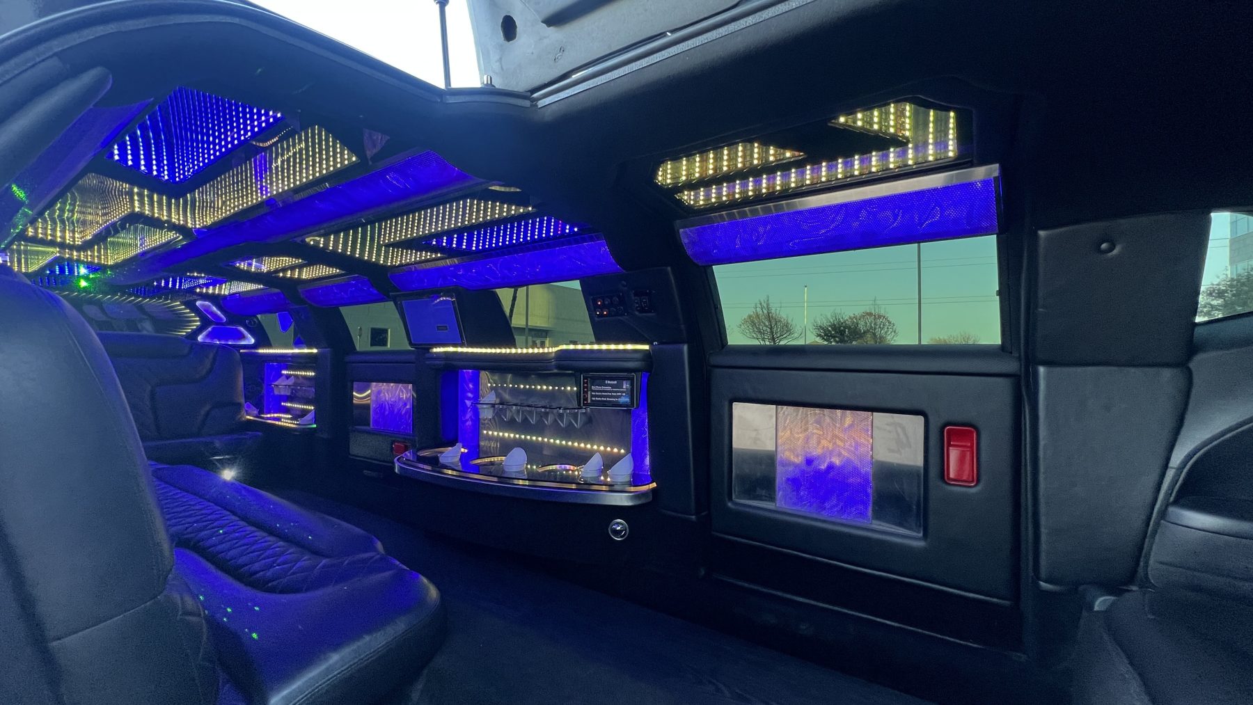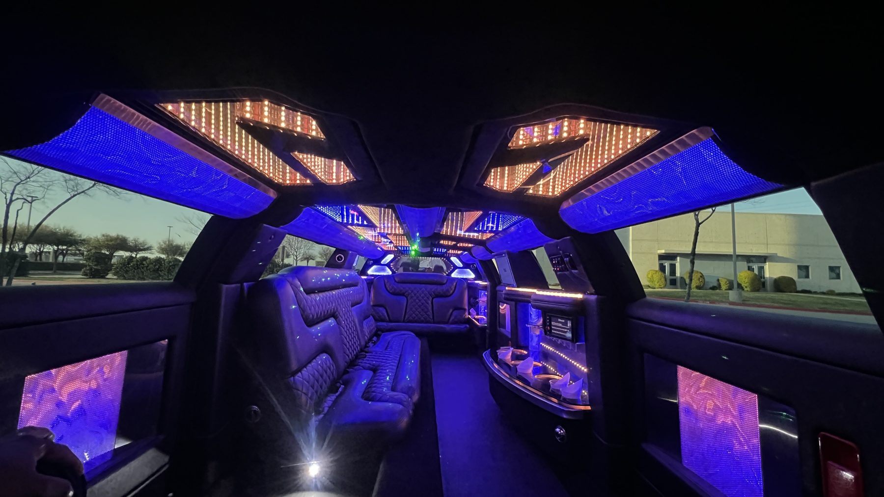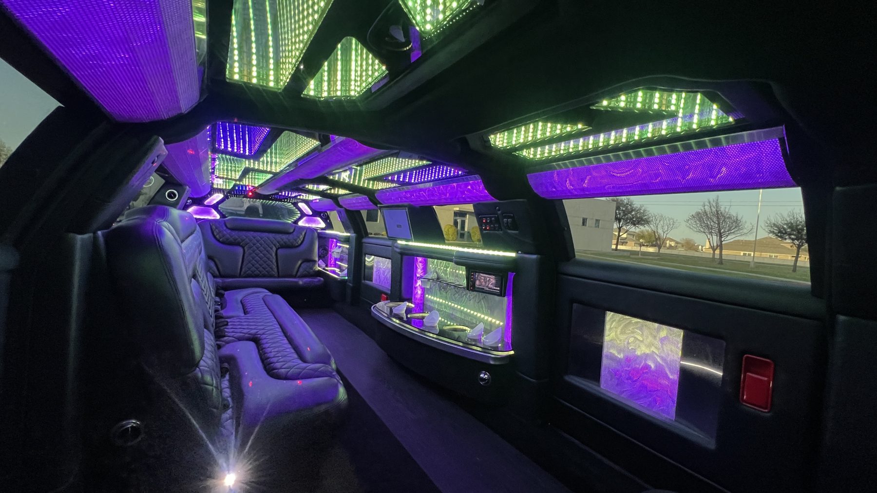 Designed with the word “Impressive” in mind, the interior of the Dodge Challenger limousine is nothing short of spectacular. From the custom lighting options to the sophisticated finishes, every detail was carefully crafted to provide an unforgettable ride. Whether you’re heading to a corporate event and need sleek, professional ambiance, or you’re out on the town with friends, the lighting can be adjusted to suit your occasion, offering everything from vibrant colors to elegant whites and blues.