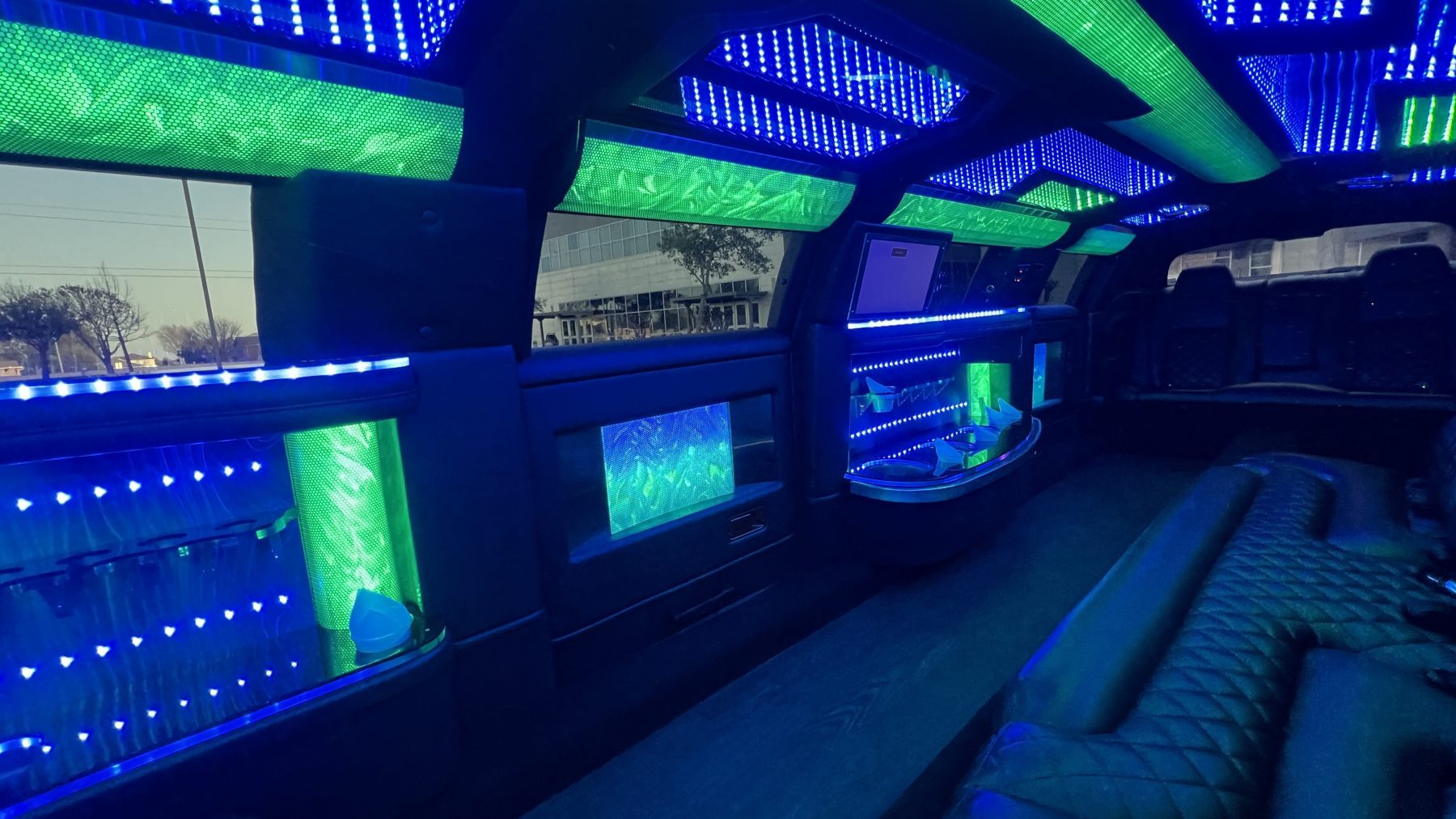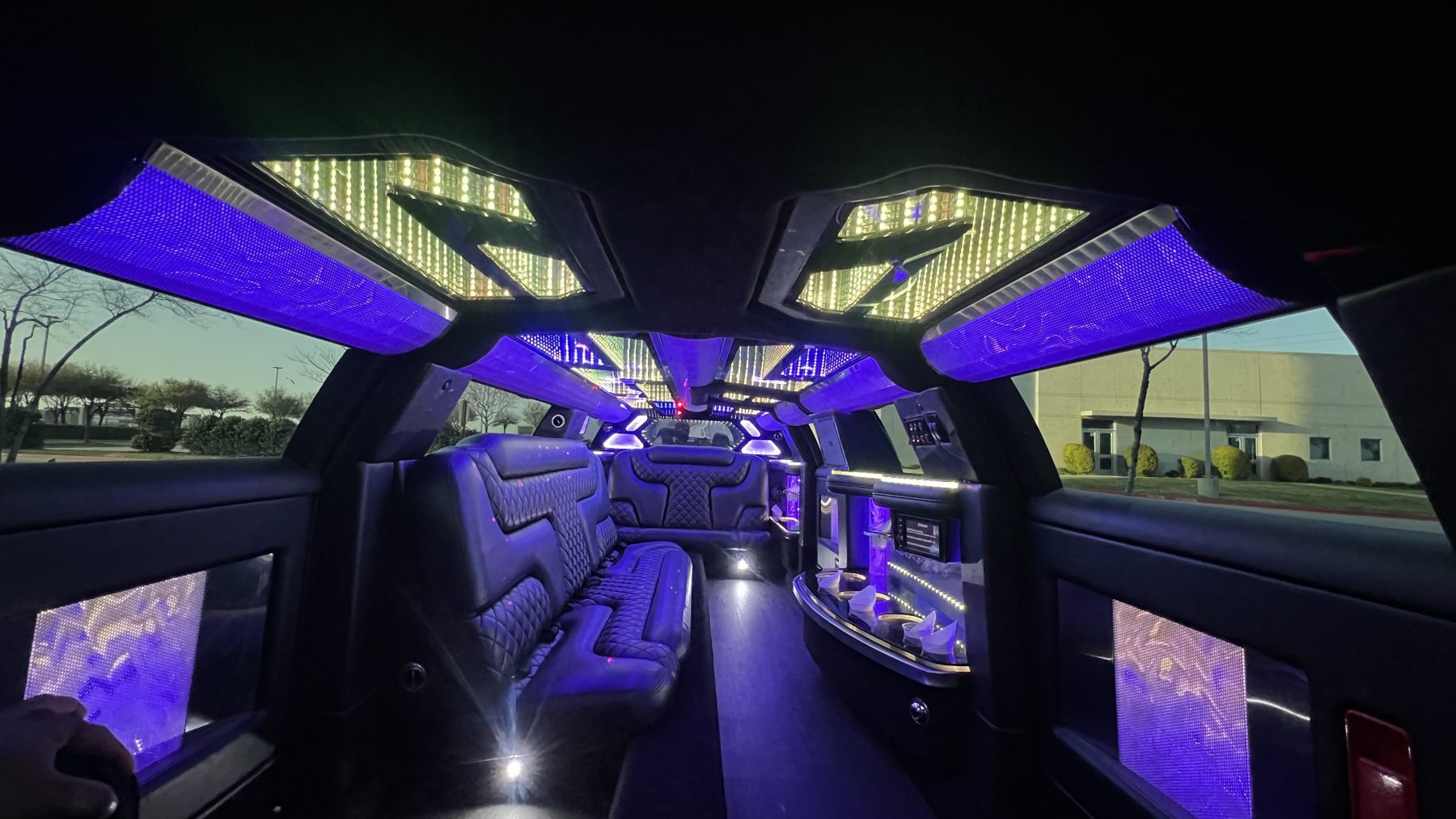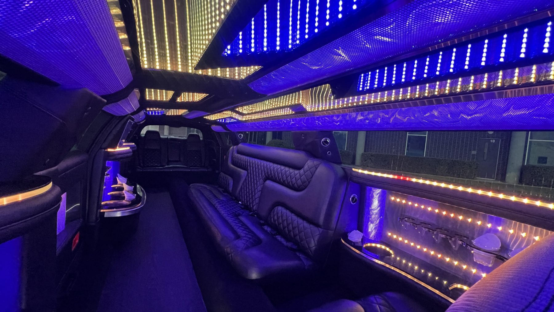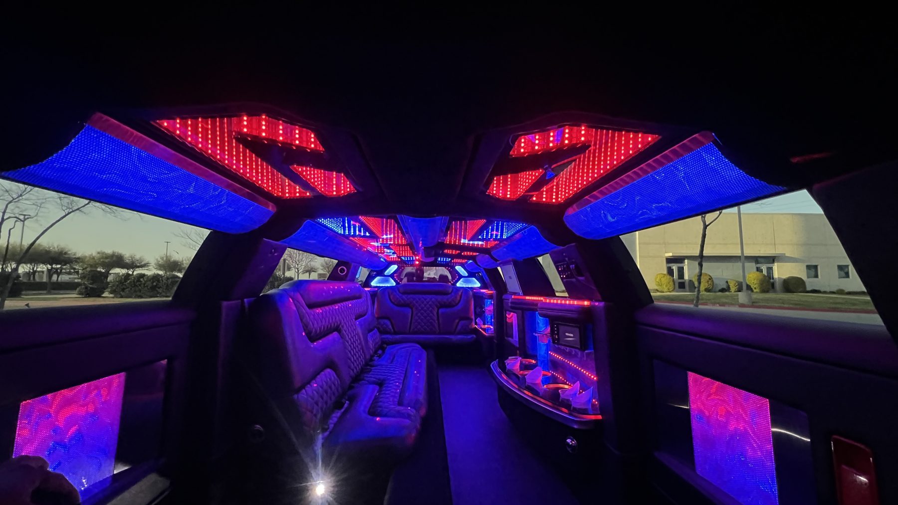 Designed with the word “Impressive” in mind, the interior of the Dodge Challenger limousine is nothing short of spectacular. From the custom lighting options to the sophisticated finishes, every detail was carefully crafted to provide an unforgettable ride. Whether you’re heading to a corporate event and need sleek, professional ambiance, or you’re out on the town with friends, the lighting can be adjusted to suit your occasion, offering everything from vibrant colors to elegant whites and blues.