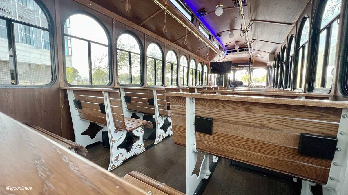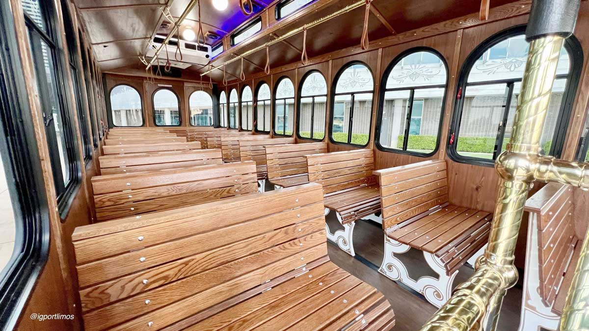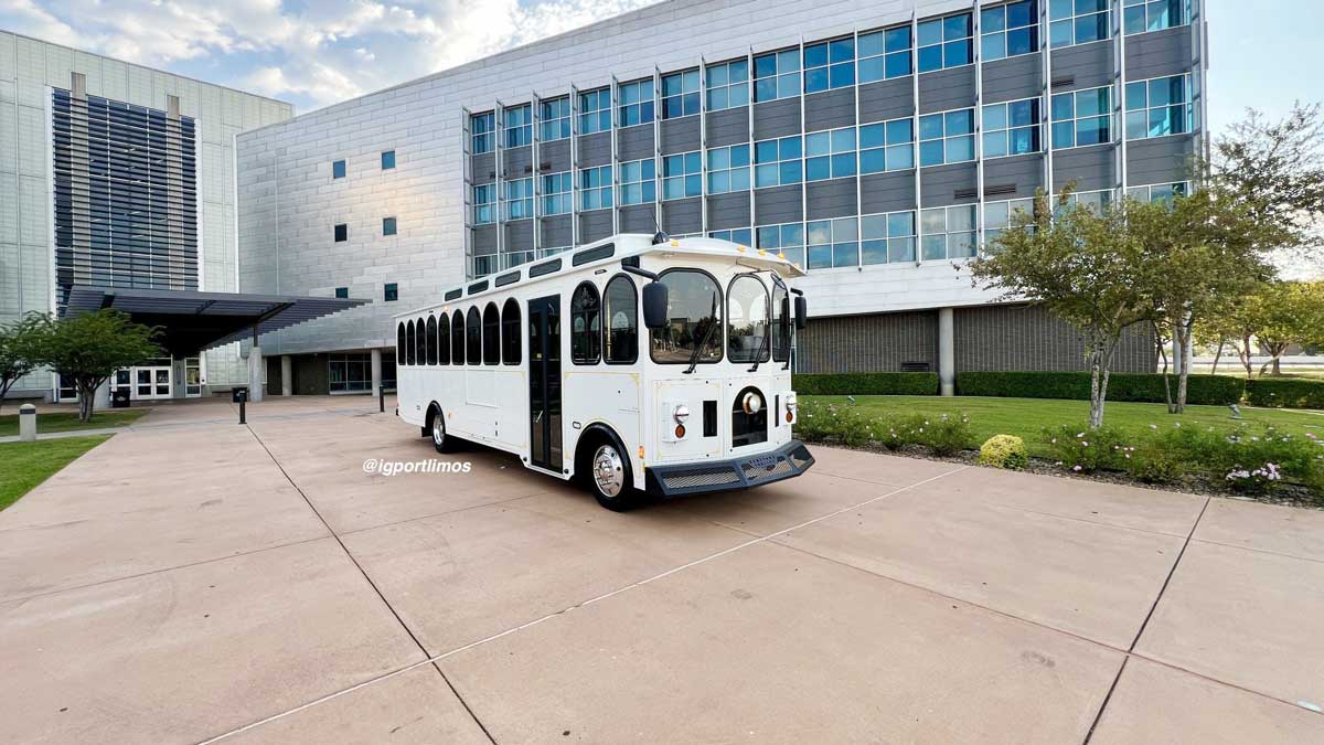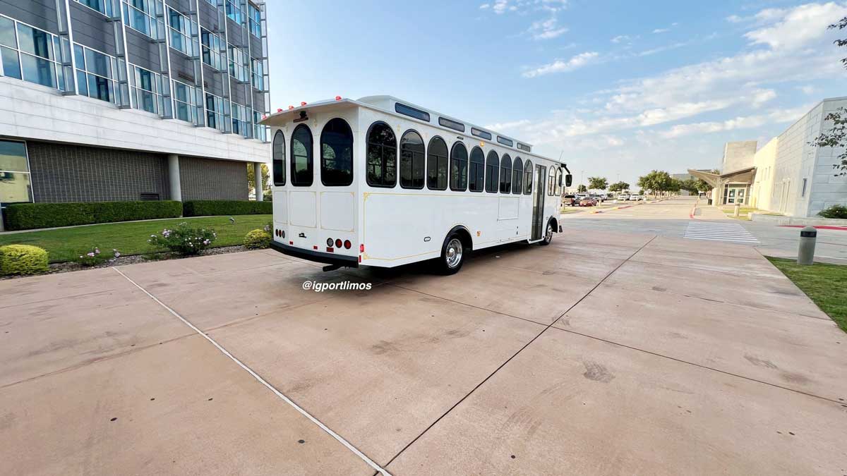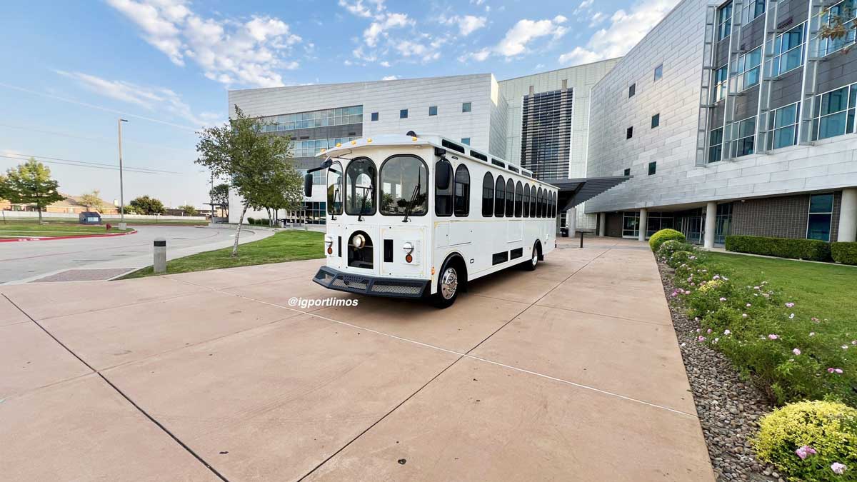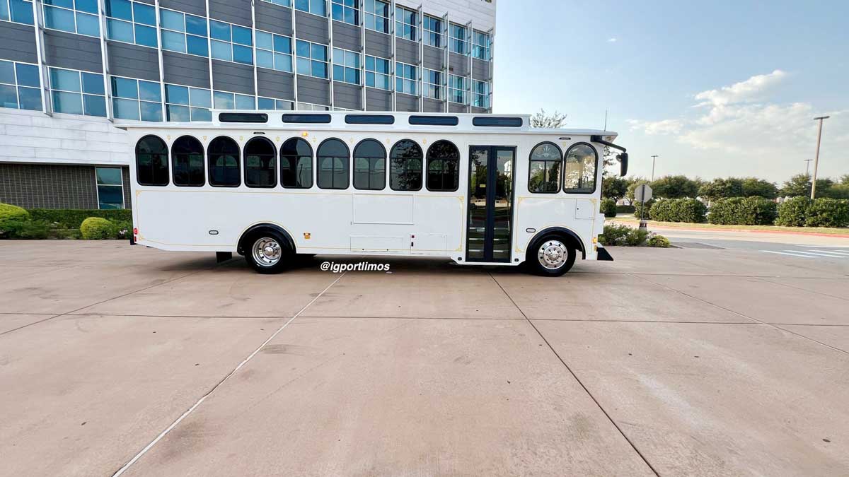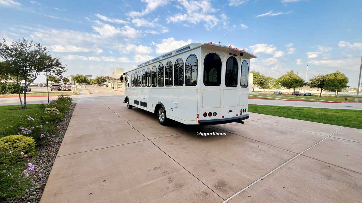 Due to overwhelming demand for our Dallas/Fort Worth Wedding Trolley Services, Igport Limos has added the most sought after top of the line white wedding trolley available in the industry. This ALL NEW ultra modern yet vintage looking luxury trolley bus features a slick exterior combined with a rich and elegant interior for the ultimate in luxury for your wedding party, corporate group, or other large event. With a balcony just like all our wedding trolleys, this vehicle will transport large groups in total first class luxury! Even the custom yellow pinstripes compliments the spiral brass bars; this makes this luxury and nostalgic trolley a unique and comfortable experience. Our trolley offers classic wooden seat, cupholders, USB power ports, cushions for additional comfort and RBG LED lights at the Coppola and floor lights to set the mood for a party or accent blue/white LED lighting for corporate event. From the air-ride suspension to state of the art electronics, this trolley is the BEST of the BEST. Add charm to your big day by traveling to your ceremony aboard our elegantly-styled wedding trolley. The entire bridal party can ride together, making your arrival to the chapel, photo site, and reception even more memorable. Our classic trolleys are perfect for candid wedding group pictures. You may have family and friends arriving from all over the state, or even the country. Many of these people may be unfamiliar with the area; so let us be your designated driver, helping your family and friends get to the wedding ceremony and back safely to the hotel after the reception.