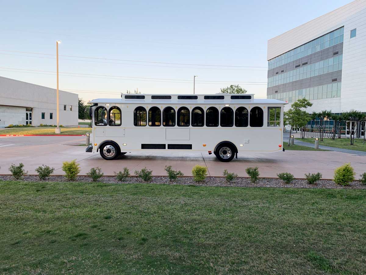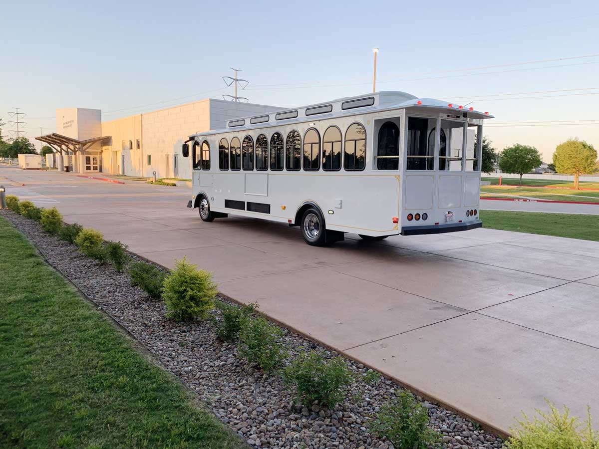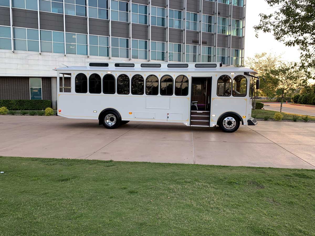 Due to overwhelming demand for our Dallas/Fort Worth Wedding Trolley Services, Igport Limos has added the most sought after top of the line white wedding trolley available in the industry. This ALL NEW ultra modern yet vintage looking luxury trolley bus features a slick exterior combined with a rich and elegant interior for the ultimate in luxury for your wedding party, corporate group, or other large event. With a balcony just like all our wedding trolleys, this vehicle will transport large groups in total first class luxury! Even the custom yellow pinstripes compliments the spiral brass bars; this makes this luxury and nostalgic trolley a unique and comfortable experience. Our trolley offers classic wooden seat, cupholders, USB power ports, cushions for additional comfort and RBG LED lights at the Coppola and floor lights to set the mood for a party or accent blue/white LED lighting for corporate event. From the air-ride suspension to state of the art electronics, this trolley is the BEST of the BEST. Add charm to your big day by traveling to your ceremony aboard our elegantly-styled wedding trolley. The entire bridal party can ride together, making your arrival to the chapel, photo site, and reception even more memorable. Our classic trolleys are perfect for candid wedding group pictures. You may have family and friends arriving from all over the state, or even the country. Many of these people may be unfamiliar with the area; so let us be your designated driver, helping your family and friends get to the wedding ceremony and back safely to the hotel after the reception.Get a Quote